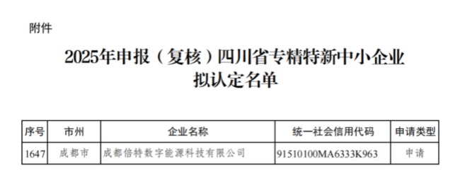 倍特數能獲四川省專(zhuān)精特新中小企業(yè)認定